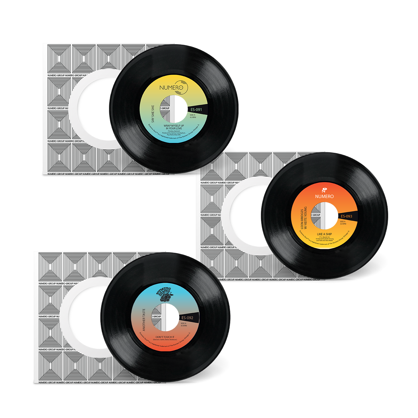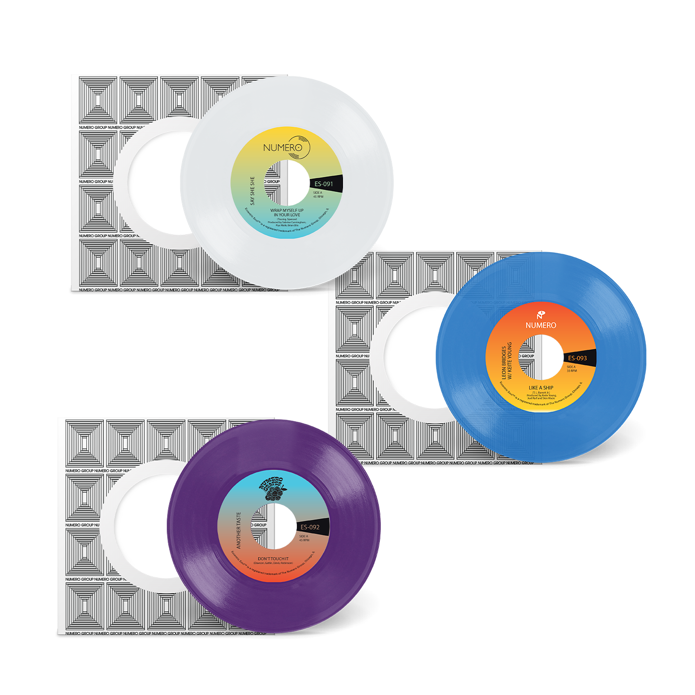 Numero's second bundle of cover 45s is all things soulful. The Rotterdam-based Another Taste electrifies Maxx Traxx's 1984 Chicago boogie grail "Don't Touch It," which makes its debut on the 7" format here. Colemine Records' Say She She delivers a glamorous rendition of Jim Spencer's yacht-disco hit "Wrap Myself Up In Your Love." Columbia Recording artist Leon Bridges effortlessly transforms Pastor T.L. Barrett's "Like A Ship," updating the 50 year old gospel soul classic for the 21st century. All three are housed in a newly imagined Numero custom sleeve, reflecting the many shades of our ongoing Eccentric Soul 45 imprint.