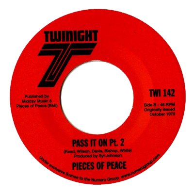 Though they were the most revered group of session musicians in Chicago, the Pieces Of Peace only managed to issue one recording during their larger-than-life existence. As a live band, they backed almost every major Chicago artist at one time or another, including luminaries such as Jackie Wilson, Syl Johnson, Gene Chandler, and the Artistics. But in their spare time, they had developed a unique, hard funk sound with Afro-centric sensibilities that had one foot in the mainstream R&B of their "day job," and the other in Chicago’s underground scene led by Phil Cohran and his Artistic Heritage Ensemble and the Pharaohs. "Pass It On” is an early step in the development of the Pieces Of Peace sound. Percussion heavy, lengthy bass vamps, and jazzy solos that meander well off page forced the jam to be broken out over two sides of a 45.