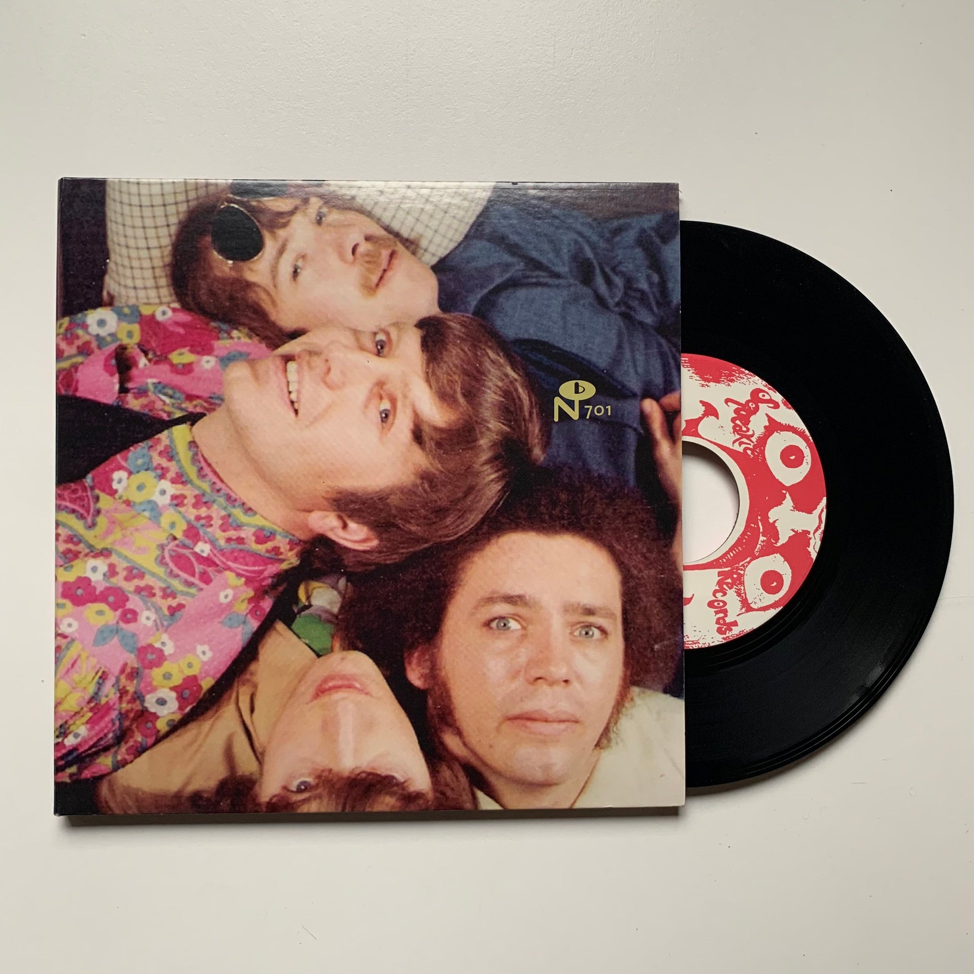 Recorded in an actual cave in western Missouri, the quartet formerly known as the Fabulous Four emerged from the depths in 1969 with an album’s worth of wasted psychedelia. Helmed by the Electric Prunes’ Michael Quint, the session produced one promo-only 45, bearing the truly un-pretty Squeakie label—a madman’s face in red-on-white, howling out of the spindle hole. The songs blend backwards guitar lines, Flamenco runs, triple-tracked vocals, heavy distortion, handclaps, key vamps, a Stones rip, and extremely absurd lyrical content. “Mustache In Your Face” and its flip have been paired with two other magical numbers and stuffed into a cherry gatefold sleeve.