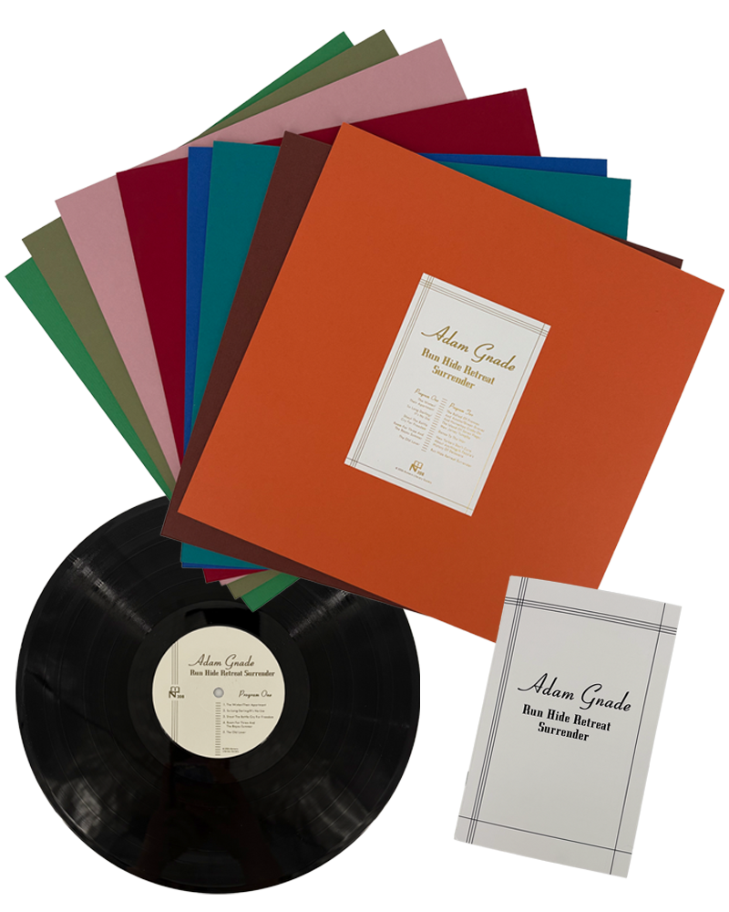 Issued in an edition of 150 copies, Runhideretreatsurrender is the first title selected for inclusion in the Numero Literary Society. Handmade by society founder Ken Shipley, the artisanal LP is backed by a stiff square of gold leaf-smothered mat board in eight different colors. A booklet of Gnade's lyrics are included for easy follow-along. You are heading home.