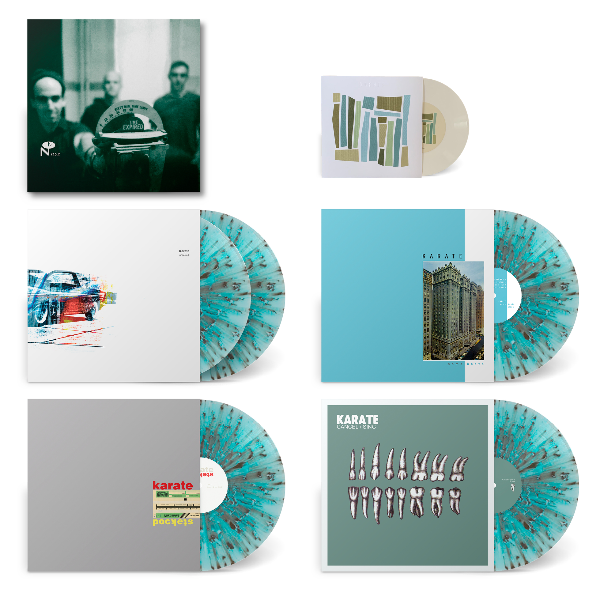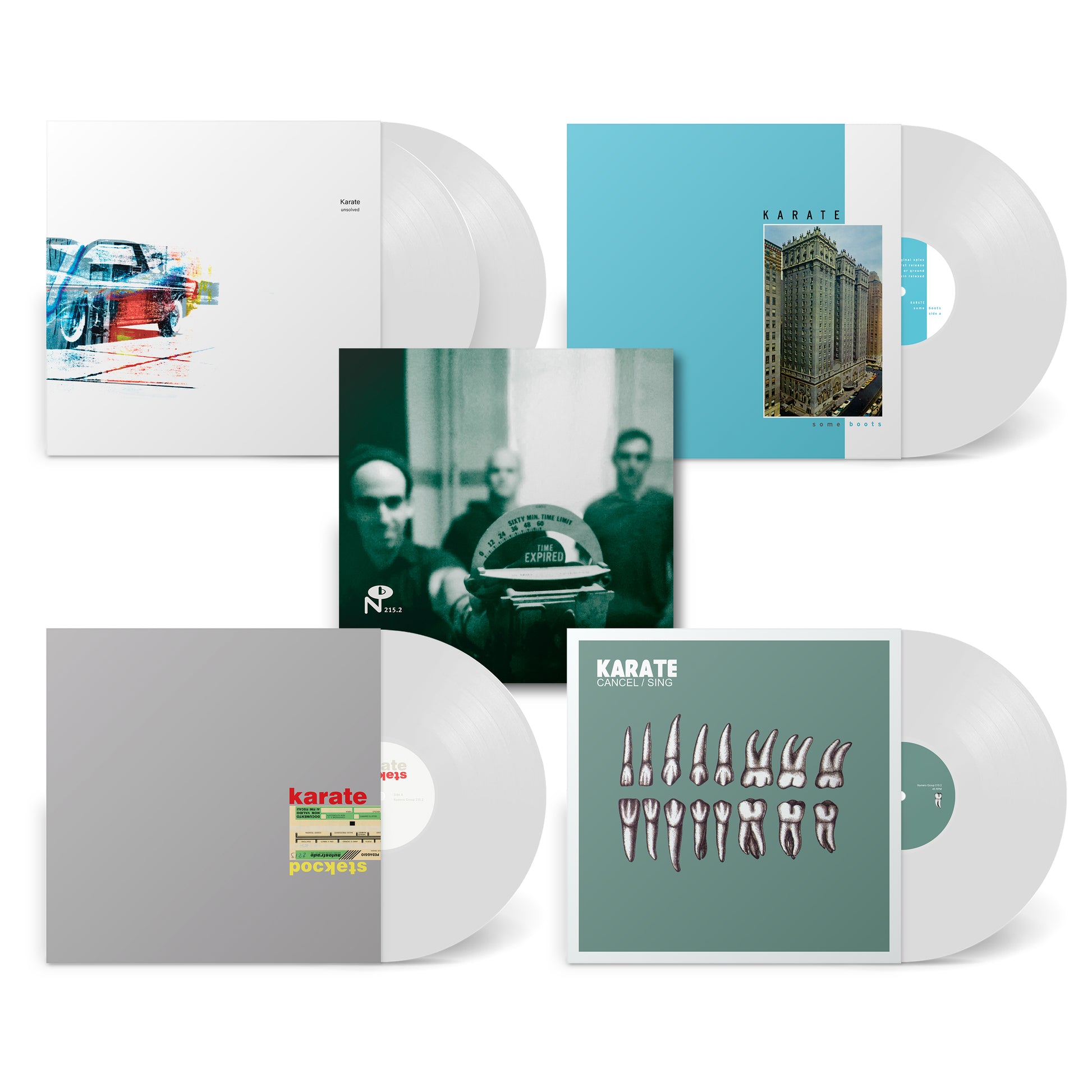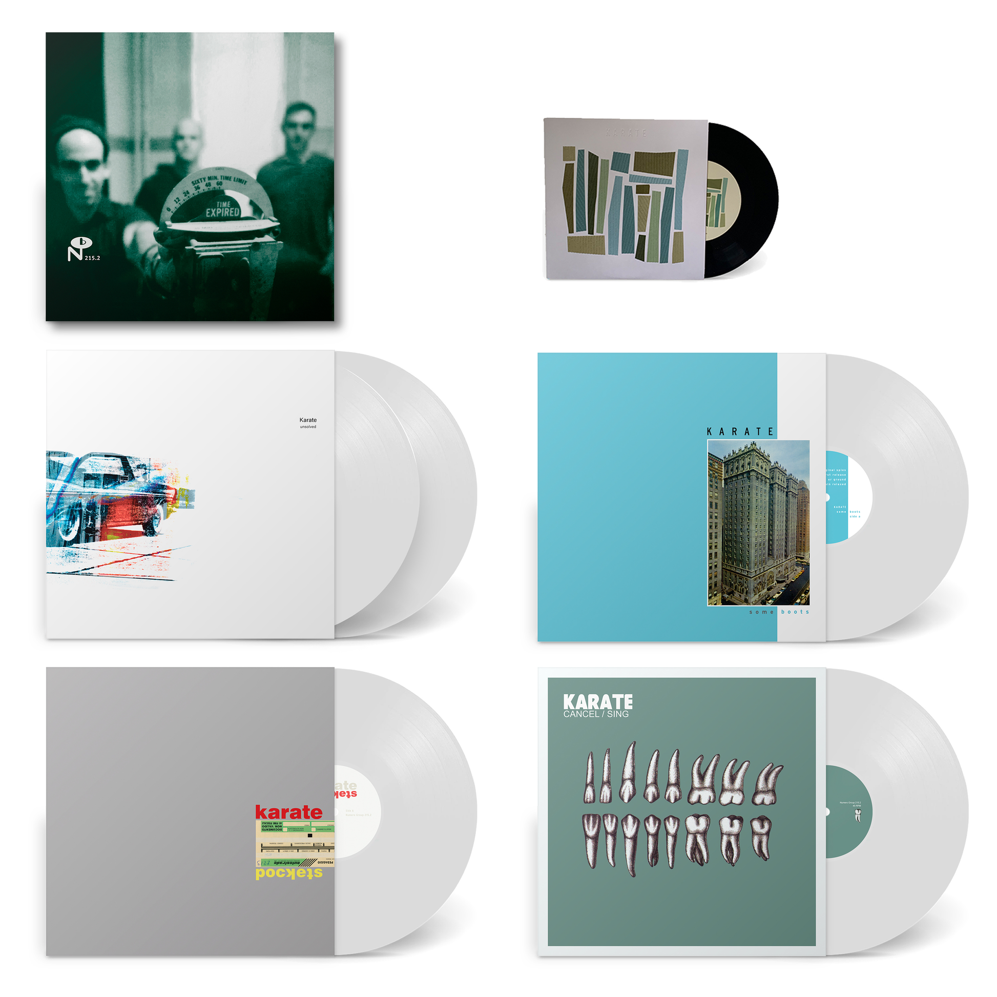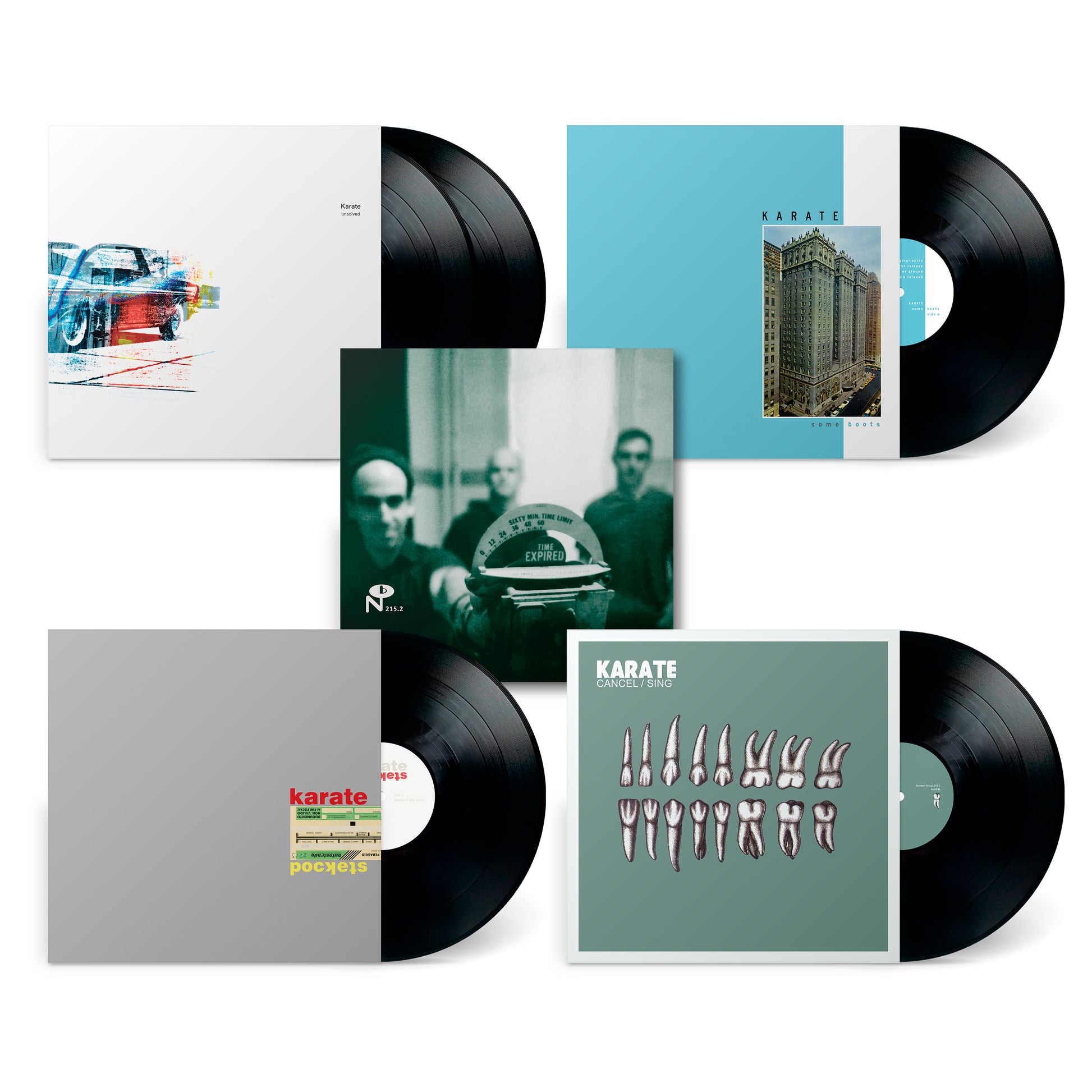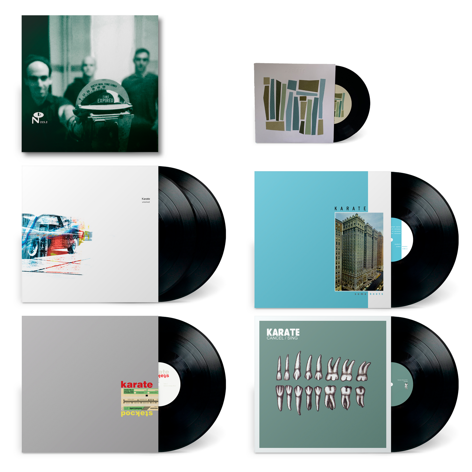 At the turn of the century and after three albums, Karate’s tenure within the insular east coast indie rock scene had expired, but the band was just getting started. Collected here is the band’s spacious, adventurous, and sometimes difficult second half presented in fastidious detail. This five LP box includes the trio’s Unsolved double LP (including 3 previously unissued period appropriate tracks), Some Boots, and Pockets albums, plus a first time vinyl pressing of their Cancel/Sing EP, all annotated by Geoff Farina’s account of Karate’s adulthood and Andy Hong’s insights into the trio’s recording process.